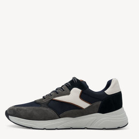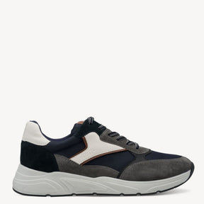 Farvekombinationen i navy og grå skaber en diskret men moderne kontrast, der nemt kan styles med alt fra jeans til chinos. Over- og indermaterialet er en gennemført mix af ægte læder og syntetiske tekstiler – en sammensætning, der både er holdbar og giver et smartere finish. Det aftagelige læderfodindlæg sikrer desuden et behageligt klima for foden og øger levetiden på skoen.